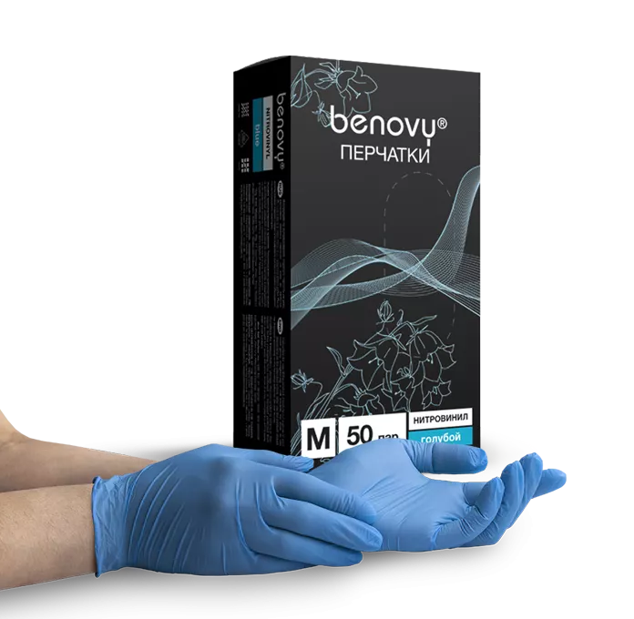 Перчатки нитровиниловые одноразовые «BENOVY», цвет: голубой, размер L, 50 пар