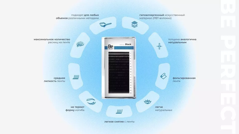 Be Perfect предлагает широкий выбор толщины и изгибов ресниц, что позволит каждому мастеру создать идеальный результат для каждого клиента, при этом современная технология помогает создать не только классическое, но и эффектное объемное наращивание.