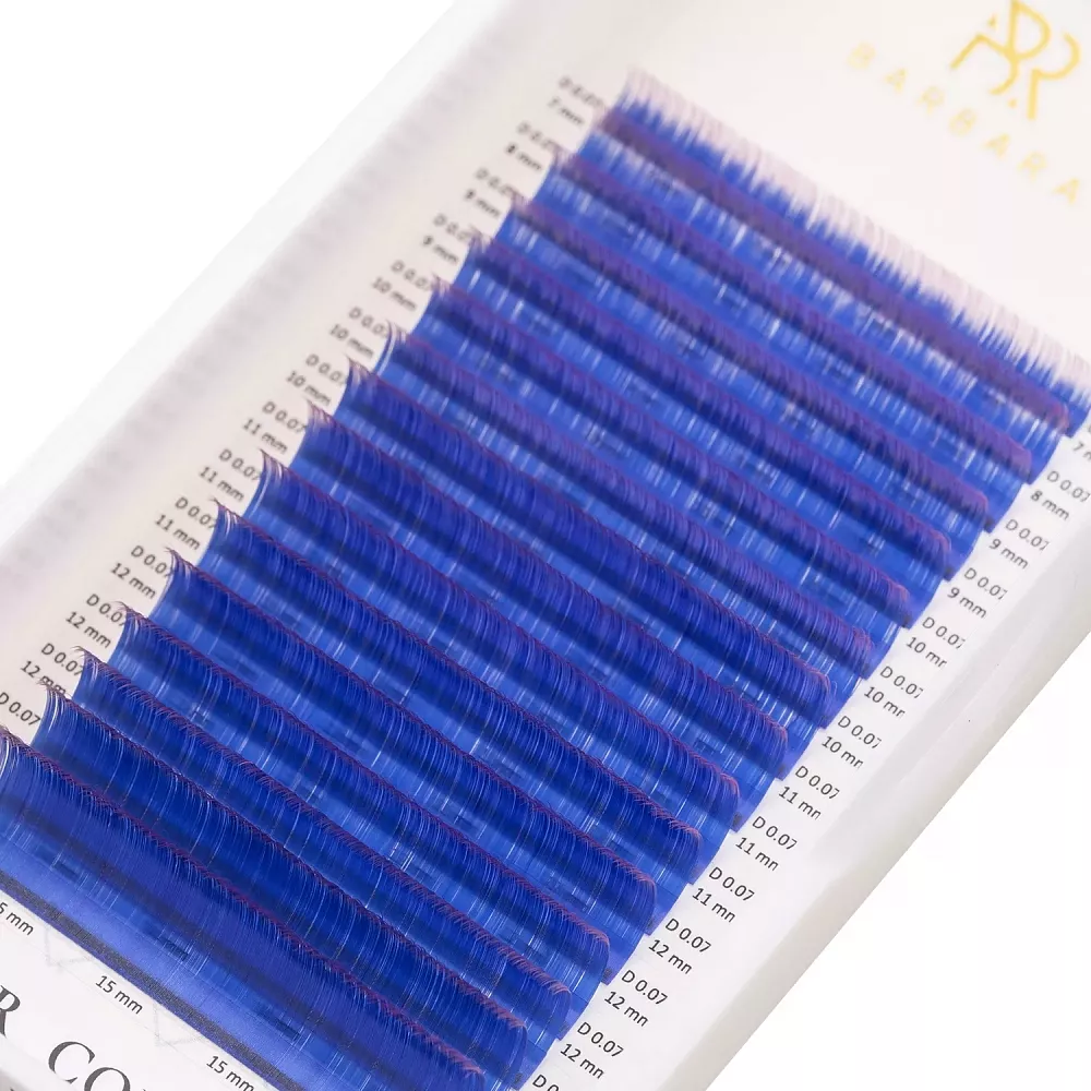 В основании комбинированных сине-фиолетовых ресниц синий цвет, который плавно перетекает в кончик фиолетового цвета. Очень мягкое и интересное сочетание. Подходят для любого типа наращивания и любой техники формирования пучков. Могут использоваться как начинающими мастерами, так и профессионалами высокого уровня.