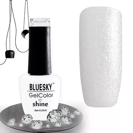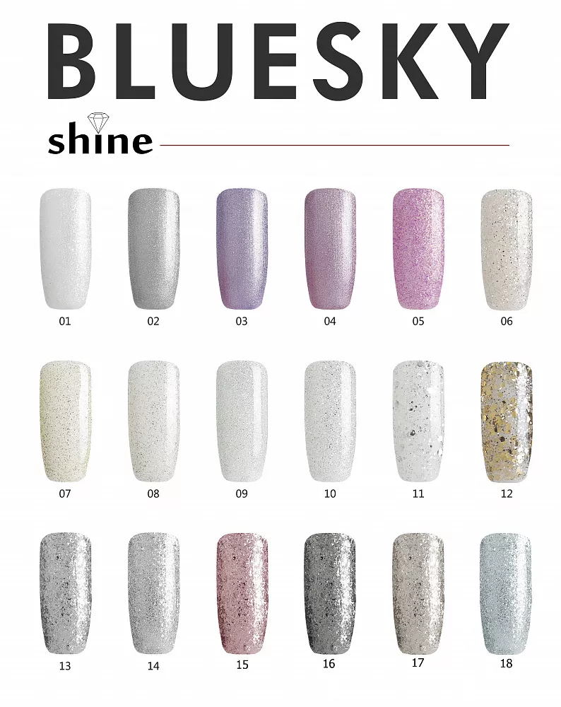 Палитра BlueSky "SHINE" представлена 18-ю великолепными мерцающими цветами с шиммером и блестками. Оттенок "Shine" #01 отлично сочетается с однотонными оттенками гель-лаков, добавляя вашему маникюру волшебное жемчужно-снежное сияние