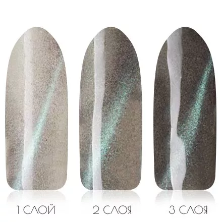 4. Для получения эффекта «Кошачий глаз» поднесите магнит перед сушкой последнего слоя гель-лака. Поднесите магнит ребром на расстоянии 1 см от поверхности ногтя. Удерживайте 10 секунд.