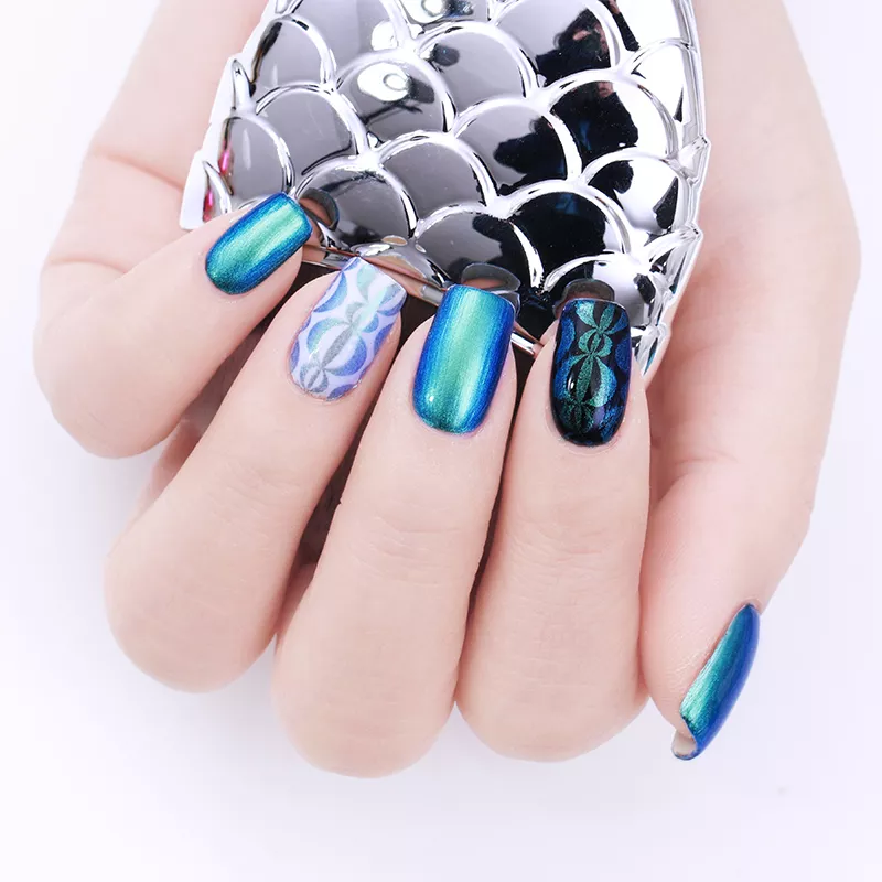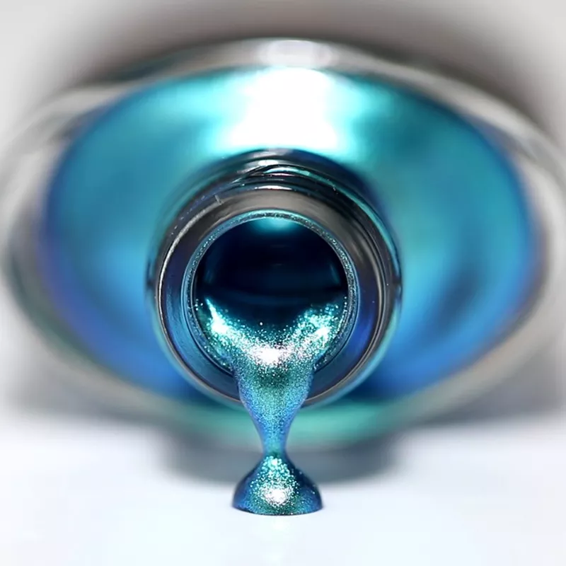 Оттенок: полупрозрачный с сине-бирюзовыми жемчужными переливами блесток, хамелеон