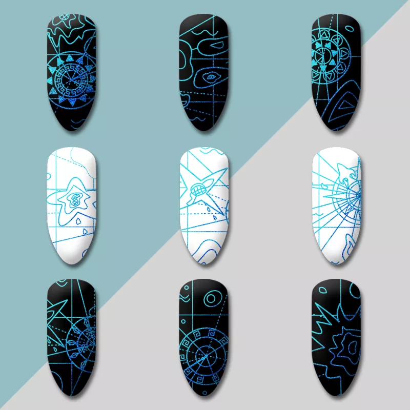 Способ применения: нанести небольшое количество высокопигментированного лака для стемпинга на пластину с трафаретами, убрать излишки скребочком, придавить подушечку-штамп к рисунку и перенести его на ноготь. После перекрыть рисунок защитным верхним покрытием.