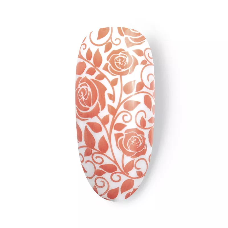 Способ применения: нанести небольшое количество высокопигментированного лака для стемпинга на пластину с трафаретами, убрать излишки скребочком, придавить подушечку-штамп к рисунку и перенести его на ноготь. После перекрыть рисунок защитным верхним покрытием.