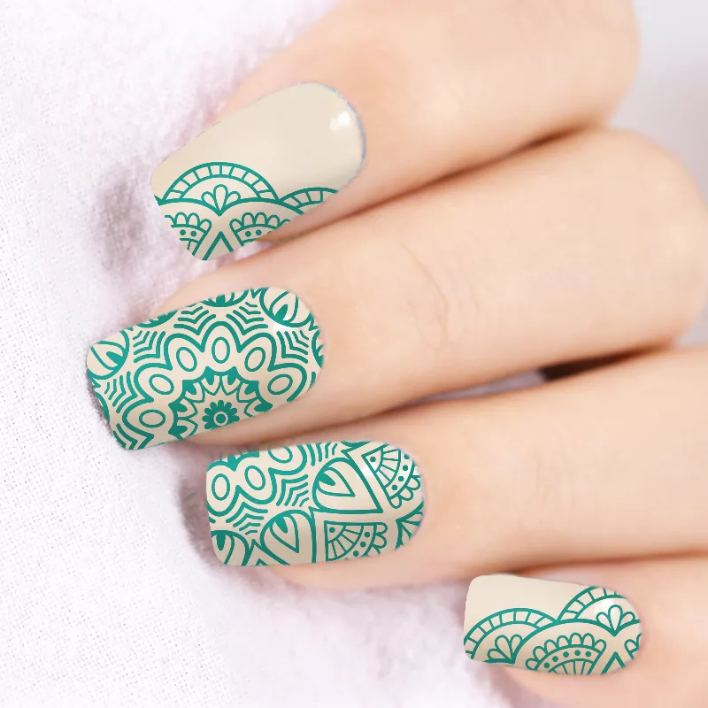 Способ применения: нанести небольшое количество высокопигментированного лака для стемпинга на пластину с трафаретами, убрать излишки скребочком, придавить подушечку-штамп к рисунку и перенести его на ноготь. После перекрыть рисунок защитным верхним покрытием.