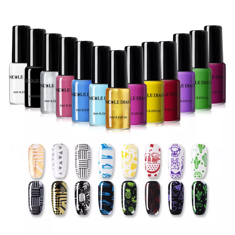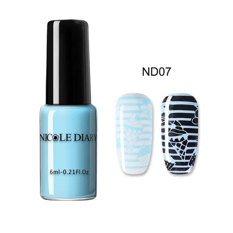 Лаки Nicole Dairy - качественные лаки для стемпинга, которые имеют высокую концентрацию пигмента в составе, благодаря чему смотрятся ярко и насыщенно. Обладают густой консистенцией, но легко ложатся на пластину или диск. Их преимущество - оптимальная скорость высыхания, не засыхают на штампе. Рисунок хорошо переносится на ноготок (даже самые мелкие детали остаются видны), имеет четкий контур и не смазывается после нанесения топового покрытия. Узоры особенно выигрышно смотрятся на ноготке, который покрыт контрастным цветом.