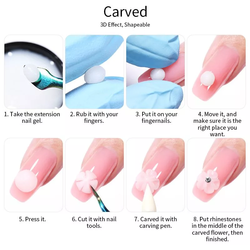 Так же материал можно смешивать с глиттером и другими материалами для дизайна, позволяя создавать эффектное наращивание и декор ногтей. Поверх геля можно использовать втирки для дизайна.