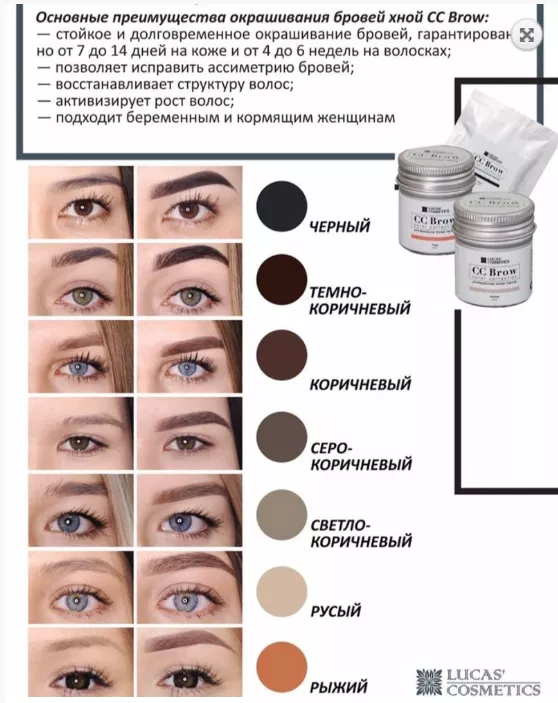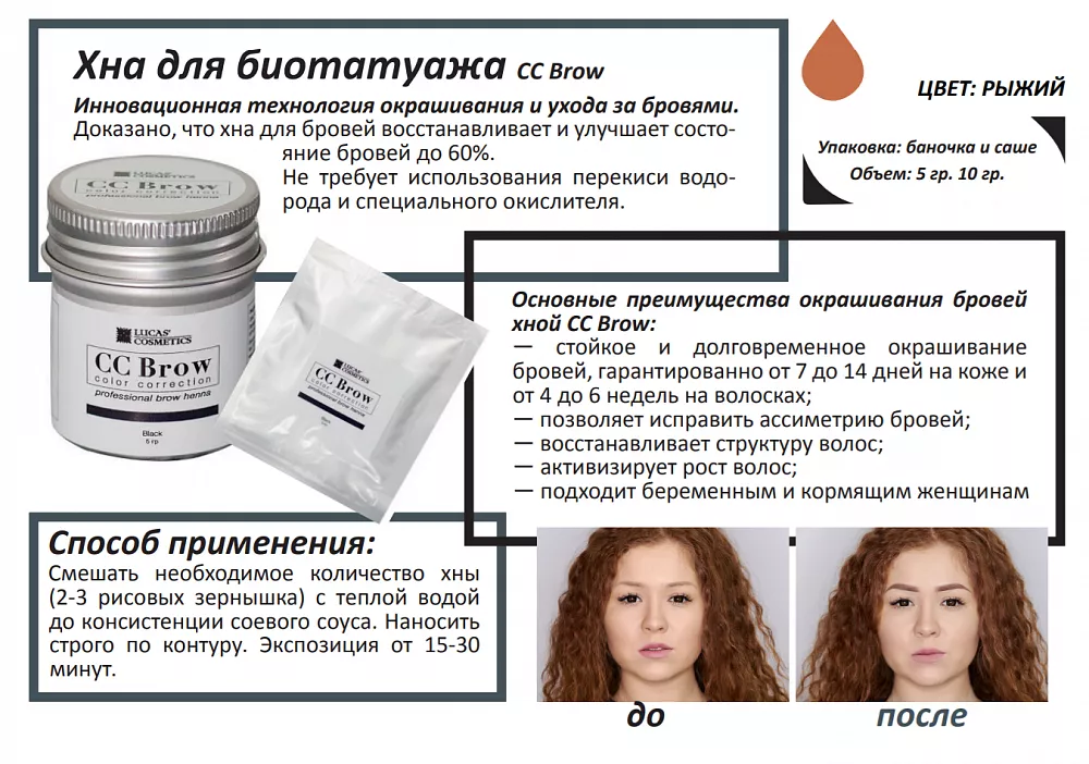 Инновационная технология ухода и окрашивания бровей хной с эффектом татуажа CC Brow. Такое окрашивание держится на коже 7-14 дней, на волосках хранится до 6 недель. Кроме того, доказано, что хна для бровей восстанавливает и улучшает состояние бровей до 60%. Не требует использования перекиси водорода и специального окислителя.