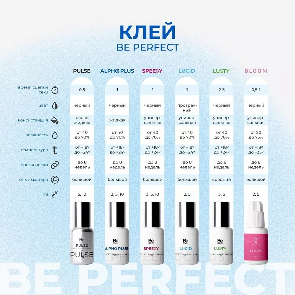 Клей Be Perfect для наращивания ресниц Lusty применяется для приклеивания искусственной ресницы к натуральной лэшмейкерами со средним опытом работы. Универсальная консистенция позволяет скорректировать размещение ресниц во время процедуры наращивания, а количество испарений сведено к минимуму, что снижает риск проявления аллергической реакции.
