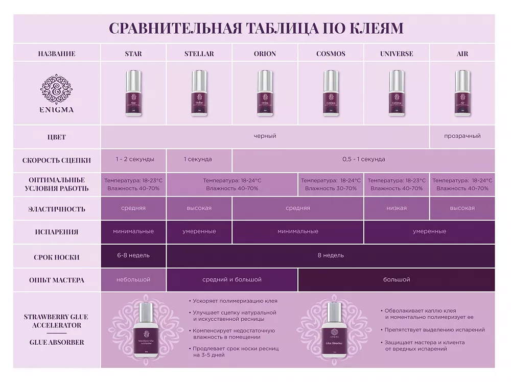 - Надёжный: полимеризуется даже при условиях нестандартной температуры и влажности. Обычный клей работает при 20-23°С и влажности 40-60%. Enigma полимеризуется при температуре 18-23°С и влажности 40-70%.
