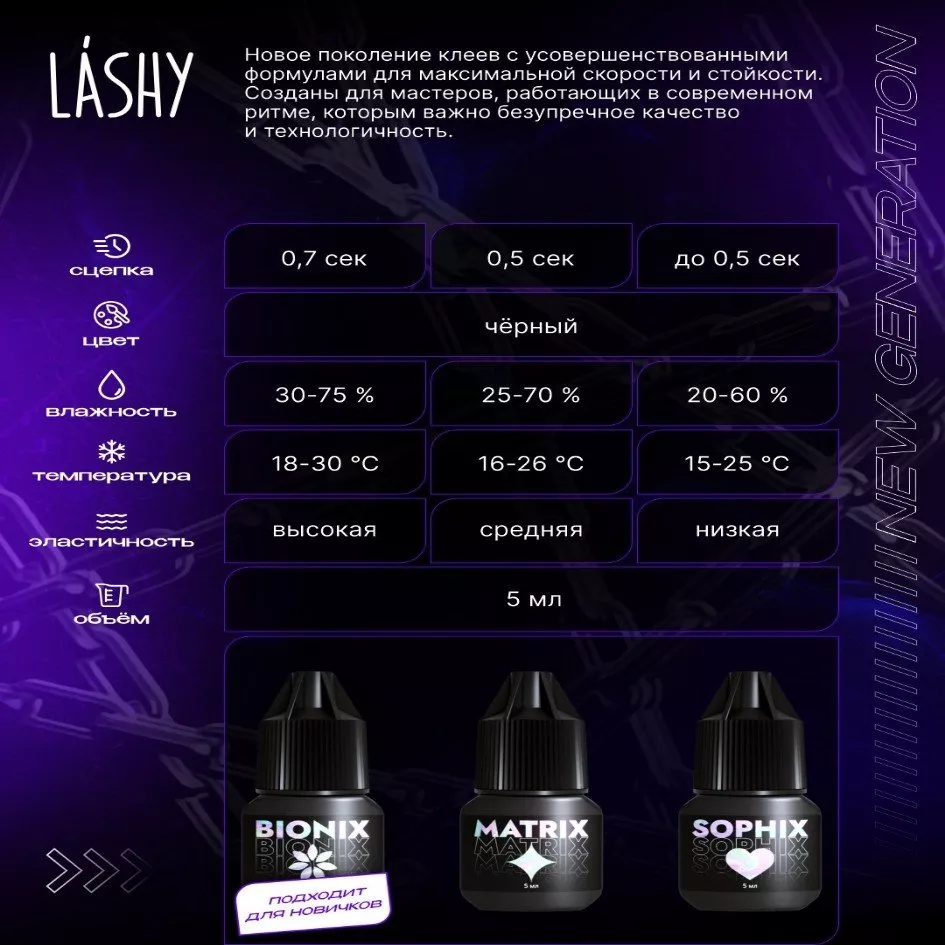 Sophix, Matrix, Bionix - новое поколение клеев от LASHY. Инновационная формула корейского сырья, протестированная технологами Академии Lovely и отвечающая трендам. Клея LASHY разработаны для мастеров, стремящихся уменьшить время процедуры наращивания без потери качества самой процедуры. Поэтому мы разработали первые клея в брендах Glory Group со сроком годности 8 месяцев* и параметрами, отвечающими различным условиям.