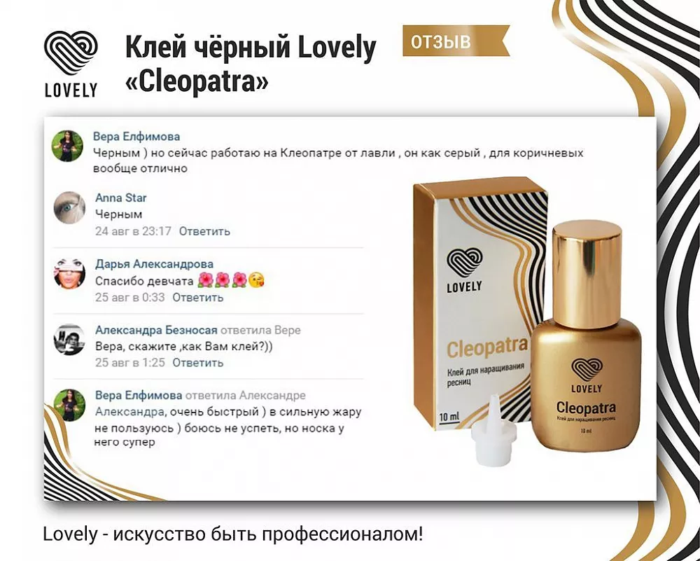 Клей Лавли Клеопатра довольно популярен среди опытных lash-мастеров. Он подходит для различных типов и объемов наращивания.