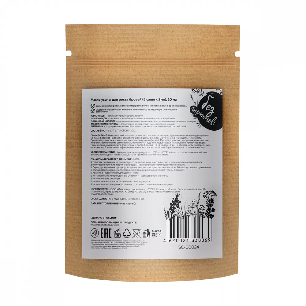 Состав набора: 5 индивидуальных саше с маслом усьмы по 2 мл, щеточка для нанесения.