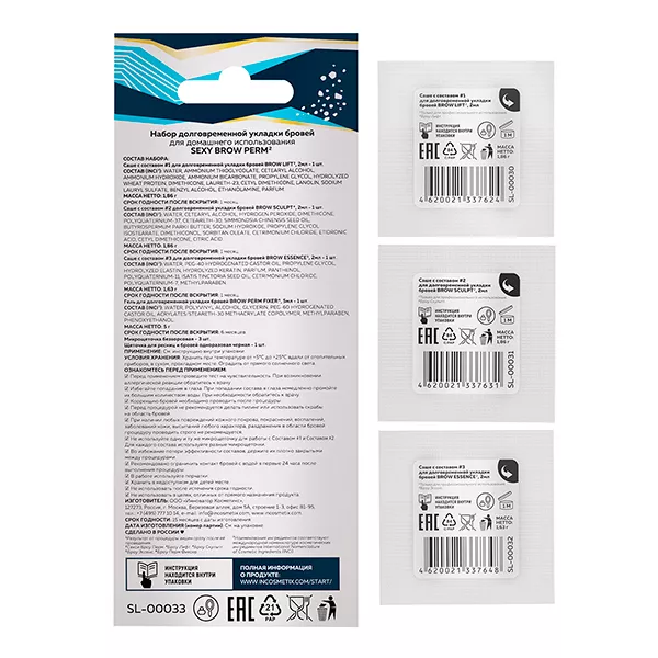 Состав #1 Brow Lift: Water, Ammonium Thioglycolate, Cetearyl Alcohol, Ammonium Hydroxide, Ammonium Bicarbonate, Propylene Glycol, Hydrolyzed Wheat Protein, Dimethicone, Laureth-23, Cetyl Dimethicone, Lanolin, Sodium Lauryl Sulfate, Benzyl Alcohol, Ethanolamine, Parfum. Состав #2 Brow sculpt: Water, Cetearyl Alcohol, Hydrogen Peroxide, Dimethicone, Polyquaternium-37, Ceteareth-30, Simmondsia Chinensis Seed Oil, Butyrospermum Parkii Butter, Sodium Hydroxide, Propylene Glycol Isostearate, Dimethiconol, Sorbitan Oleate, Cetrimonium Chloride, Etidronic Acid, Cetyl Dimethicone, Citric Acid. Состав #3 Brow Essence: Water, PEG-40 Hydrogenated Castor Oil, Propylene Glycol, Hydrolyzed Elastin, Hydrolyzed Keratin, Parfum, Panthenol, Polyquaternium-11, Isatis Tinctoria Seed Oil, Cetrimonium Chloride, Polyquaternium-7, Methylparaben. Гель Sexy Brow Perm Fixer: Water, Polyvinyl Alcohol, Glycerin, PEG-60 Hydrogenated Castor Oil, Acrylates/Steareth-30 Methacrylate Copolymer, Methylparaben, Phenoxyethanol. |