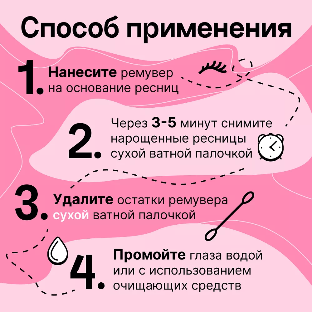 Состав нужно наносить точно на участки сцепки, а затем, после выдержки, аккуратно удалить реснички. Для удаления остатков ремувера можно использовать сухой ватный диск или палочку.