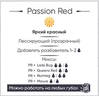 Поскольку PR прозрачный, с его помощью можно создать лишь акварельный эффект на губах. Но если необходим помадный эффект, можно добавить в него несколько капель тёплого кроющего пигмента, например Lady Bug.