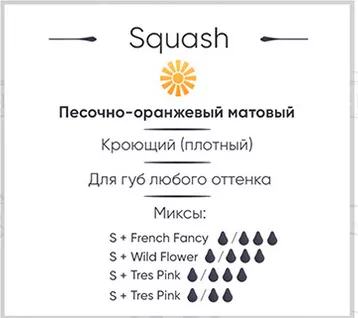 Приглушённый матовый оранжевый цвет с песочным оттенком. На очень холодных губах заживёт нейтральным бежевым оттенком натуральных губ.