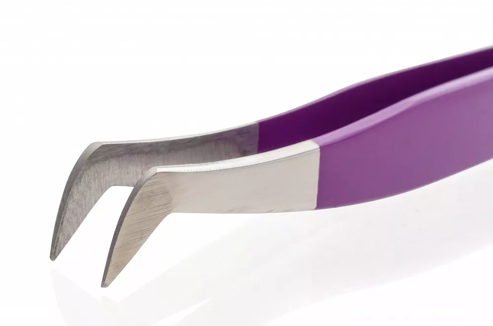 Благодаря загнутой форме кончиков пинцета, имеющих идеальное схождение по всей длине, облегчается и ускоряется процесс захвата одновременно нескольких ресниц для объёмного наращивания ресниц.
