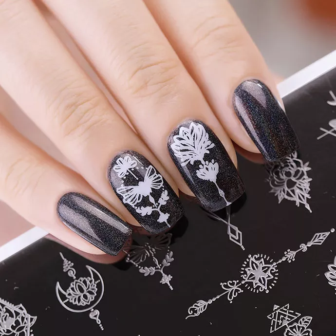 Пластина изготовлена из прочного металла. Она гладкая и блестящая, что позволяет наносить высокоточные рисунки с идеальной проработкой даже самых мелких деталей рисунка. Рисунки можно комбинировать, наносить их разными цветами лаков, добавлять стразы, жемчуг, бульйонки, а также любые другие декоративные элементы.