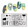 Пластина изготовлена из прочного металла. Она гладкая и блестящая, что позволяет наносить высокоточные рисунки с идеальной проработкой даже самых мелких деталей рисунка. Рисунки можно комбинировать, наносить их разными цветами лаков, добавлять стразы, жемчуг, бульйонки, а также любые другие декоративные элементы.