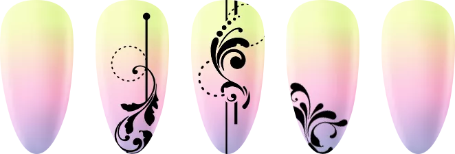 Способ применения: нанести небольшое количество краски или специального высокопигментированного лака для ногтей на пластину с трафаретами, убрать излишки скрапером, придавить подушечку-штамп к рисунку и перенести его на ноготь. После перекрыть рисунок защитным верхним покрытием.