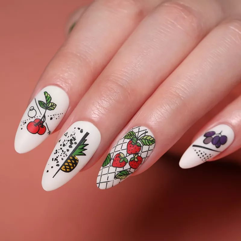 Способ применения: нанести небольшое количество краски или специального высокопигментированного лака для ногтей на пластину с трафаретами, убрать излишки скребочком, придавить подушечку-штамп к рисунку и перенести его на ноготь. После перекрыть рисунок защитным верхним покрытием.