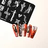 Способ применения: нанести небольшое количество краски или специального высокопигментированного лака для ногтей на пластину с трафаретами, убрать излишки скрапером, придавить подушечку-штамп к рисунку и перенести его на ноготь. После перекрыть рисунок защитным верхним покрытием.