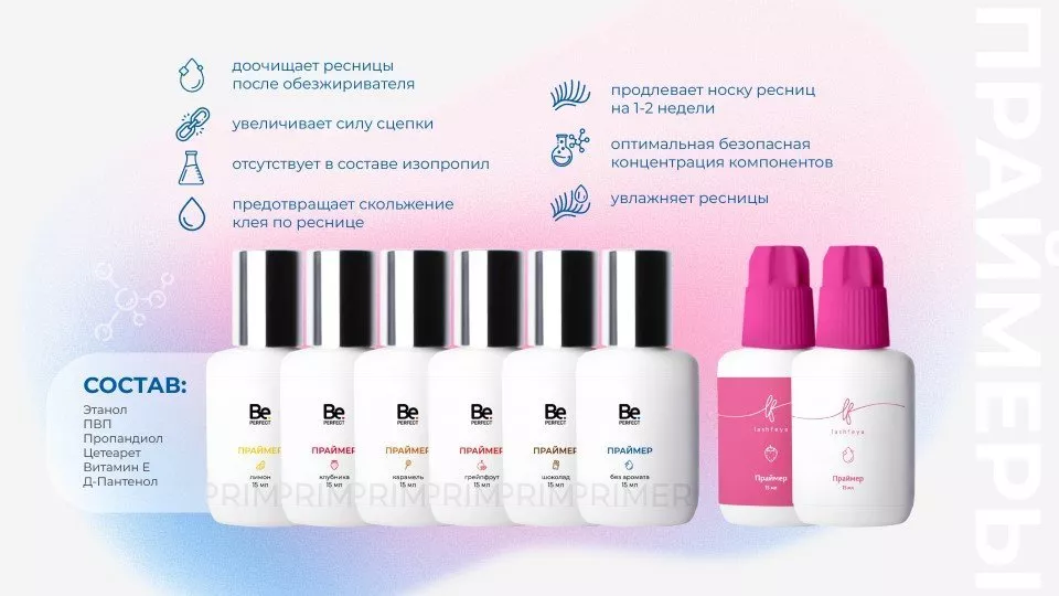 Праймер – препарат, используемый на втором этапе подготовки ресниц перед процедурой наращивания, необходимый для дополнительного очищения ресниц и легкого ухода, препятствующего обезвоживанию ресниц (за счёт PEG-8, это производное полиэтиленгликоля). Содержит компоненты, оказывающие увлажняющее и подтягивающее действие (поливинилпирролидон).Наносится только на натуральные ресницы.