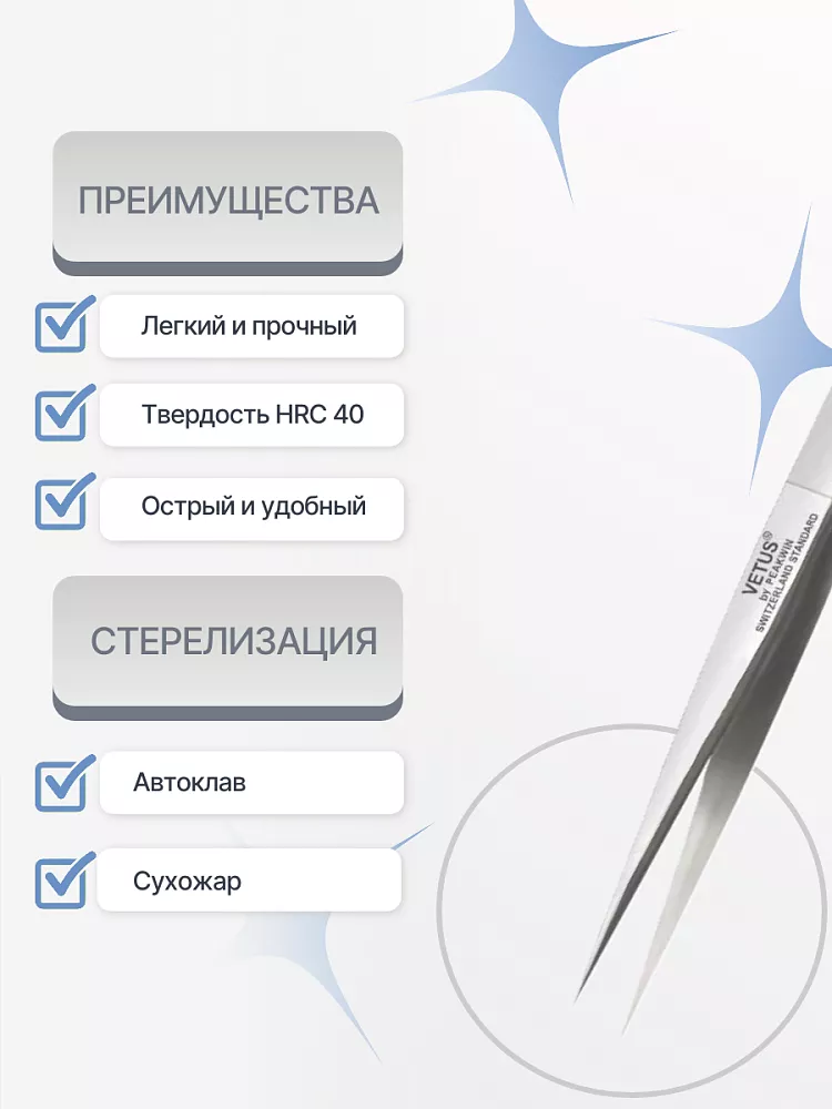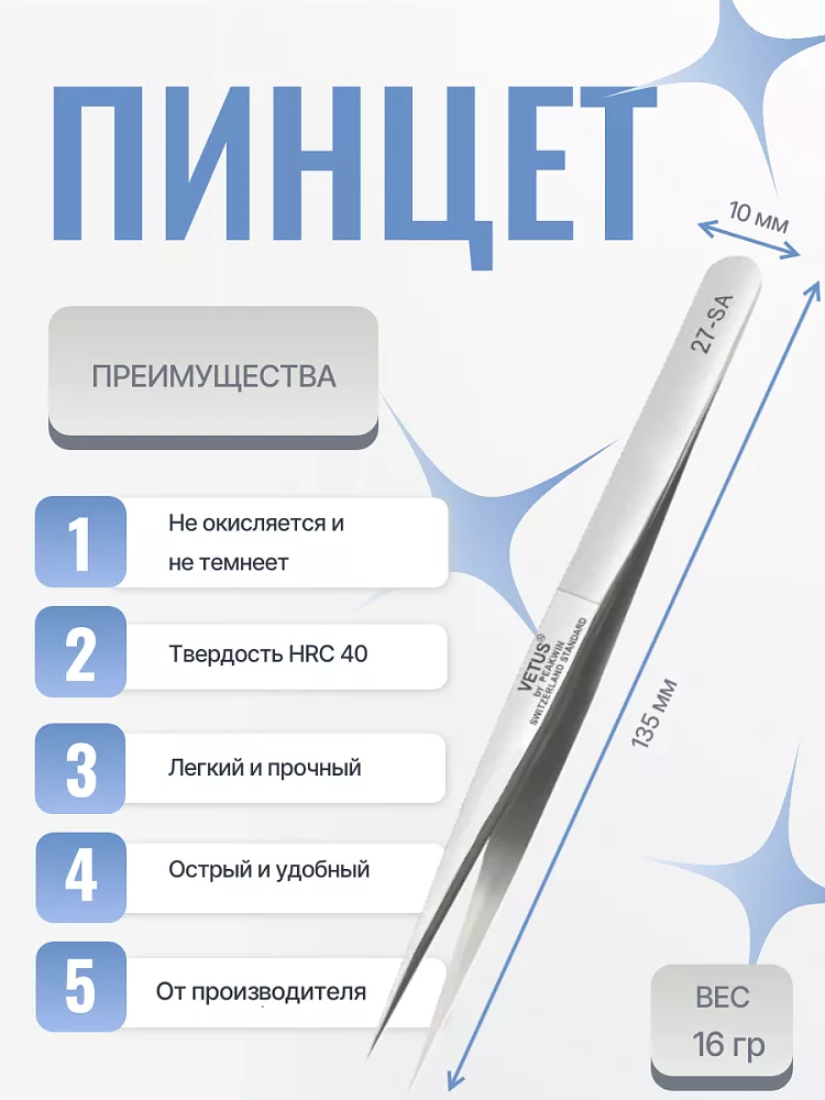 Плотное схождение створок и мягкий ход визитная карточка пинцетов Vetus. Великолепное сочетание цены и качества!