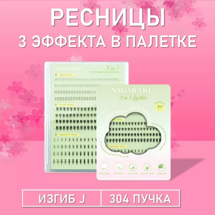 Ресницы самоклеящиеся Nagaraku три типа в одной палетке, 304 пучка M3-001