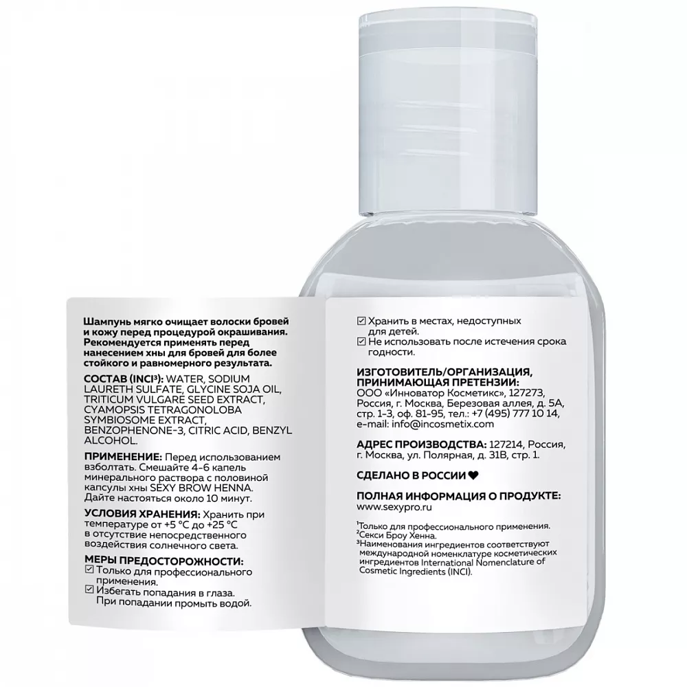 Шампунь SEXY BROW HENNA следует нанести на чистую кожу бровей круговыми движениями. После снять остатки средства влажным ватным диском, высушить кожу и волоски и перейти непосредственно к процедуре окрашивания.