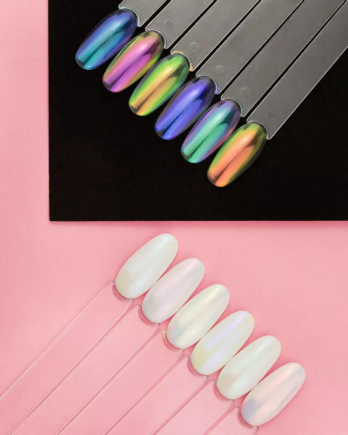 Мельчайшие частицы для втирки легко наносятся с первого раза, придают маникюру загадочный переливающийся оттенок и блеск.